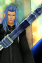 Saix uses a massive blade called a Claymore. His main Claymore is named "Lunatic" Despite many dissimilarities to real claymores, Saix does use a very large, two-handed bladed weapon. His Claymore is decorated with many additives that resemble the Nobody logo, in blues and yellows. When in normal form, Saix attacks with powerful slashes and combos with the bladed edges.