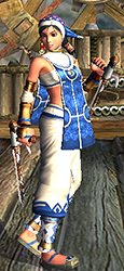 THIRD OUTFIT Talim's third outfit almost reminds me of a pirate. She is back to her two braided pony tails, with the same clasp holding her hair together. This time though, she has a bandana covering the top of her head with a few accents on it. She has a white bandeau on with a blue accented sleeveless tank top covering over it. The sides are free, allowing a breeze to enter. She has white poofy pants on that have blue triangles at the bottom. She tops off her outfit with another pair of sandals. This time the sandals look like they are a bit more supportive because they cover her toes. I would say this outfit looks like the most "tribal" or "priestess-like" outfit her three outfits. It is also her most conservative outfit, as well.