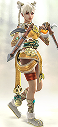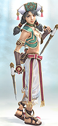 SECOND OUTFIT Talim's second outfit in Soul Calibur 4 is dramatically different from the rest of her looks. She is... well... tan and SUPER blonde! She has bangs, and her hair in really high pig tails that are braided downwards. Her hair is extremely long in this outfit. She has a yellow medallion hanging down in the shape of a butterfly. She has a yellow tank top on that is cropped. Around her stomach is a greenish-blue belt with a golden paw print on it. Attached to this belt is a giant golden cat paw print that looks like it opens (I am assuming it is a pouch to put stuff in). She is NOT wearing pants!! She has a giant ribbon wrapped around her waist. On one end of the ribbon is a crescent moon, and on the other side is a ball that we can assume is a representation of the sun. She has a red ribbon wrapped around one of her upper thighs. She has cat-like boots on that emphasize the toes. She has a golden design going up from her boot with a green pendant in the middle. Very cute but weird outfit choice for Talim!